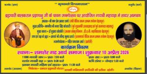 9 अप्रैल ब्रह्मचारी बालक राम प्रज्ञाचक्षु जी के 112वें पावन जन्मोत्सव पर आर्य समाज मंदिर शमशेरगढ़ में आचार्य रविन्द्र कुमार आर्य- प्रधानाचार्य, वैदिक साधन आश्रम, तपोवन गुरुकुलम के सानिध्य में ब्रह्मचारी तपोवन आश्रम के द्वारा 11000 गायत्री जाप, गायत्री यज्ञ किया जाना है,