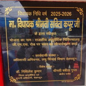 विधायक कैंट श्रीमती सविता कपूर ने बृहस्पतिवार को आयुष्मान आरोग्य मंदिर (आयुष), राजकीय आयुर्वेदिक चिकित्सालय, निरंजनपुर के सौंदर्यकृत भवन का उद्घाटन किया गया। इस अवसर पर विधायक ने कहा कि सरकार आमजन को बेहतर स्वास्थ्य सुविधाएँ उपलब्ध कराने के लिए निरंतर प्रयासरत है। इस मौके पर जिला आयुर्वेदिक एवं यूनानी अधिकारी ने मा0 विधायक को पंचायत भवन में संचालित चिकित्सालय भवन को आयुष विभाग को हस्तांतरित करने का प्रस्ताव भी रखा। इस पर विधायक ने पूर्ण आश्वासन दिया गया।